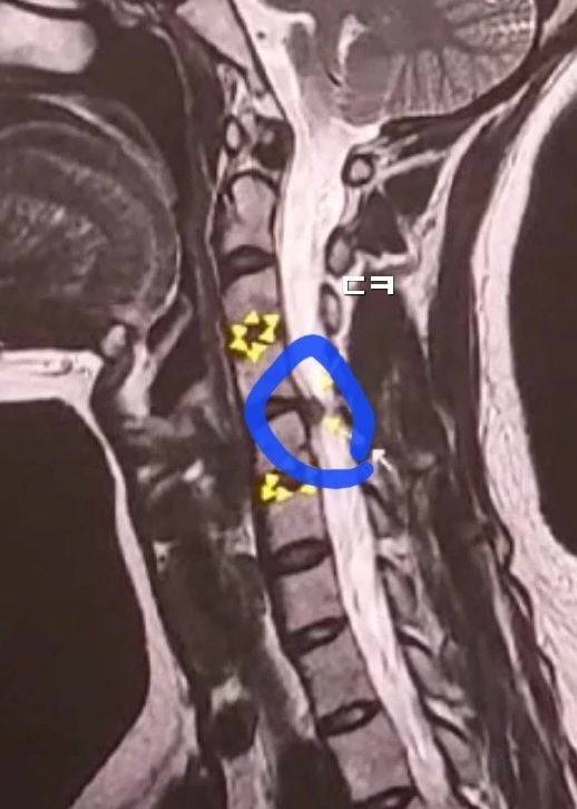 난 c5=경추5번 터짐, 사진의 c5번 부위에 운동 마비 증상와서 팔에 힘 빠짐 + 떨림. 프라이팬도 못들게 됨. 팔 들려고하면 5초이상걸림 팔이 억지로 서서히...느리게 올라감.