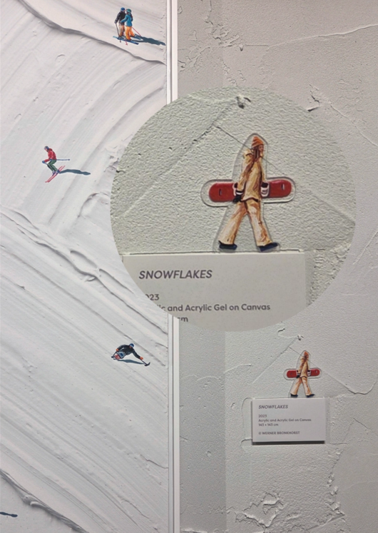 그의 작품을 아시아 최초로 서울에서 만나볼 수 있다. 종로구 그라운드시소에서 진행 중인 '워너 브롱크호스트: 온 세상이 캔버스' 전시회를 통해서다. 그라운드시소 공식 인스타그램은 ‘온 세상이 캔버스이고, 우리가 그 위를 걸어 다니는 주인공이라면 어떨까요?’ 라는 문장으로 이번 전시의 방향성을 드러내고 있다. 전시 입구에 들어서는 순간, 우리는 캔버스 안에 그려진 작은 인물들처럼 워너 브롱크호스트의 작품 세계 속 주인공이 된다.