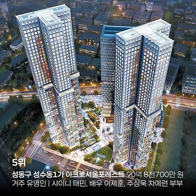 서울숲 바로 앞에 있는 초고층 주상복합.45층, 2개동으로 구성되어있으며 모두 70평 ~ 113평까지 초대형 평수 세대로만 이루어졌습니다. 한층에 최대 3세대가 거주 할 만큼 프라이빗한 편이기도 하고요. 전문직 종사자, 사업가 및 재벌 2,3세 그리고 유명인들이 거주하는 편입니다.