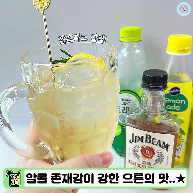 처음에는 술맛과 탄산의 존재감이 강한데, 얼음이 녹을수록 목넘김이 부드러워지고 레몬 맛도 더 잘 느껴졌어요. 깔끔한데 술 같은 술이 생각나는 날 강추! 드리는 레시피입니다.