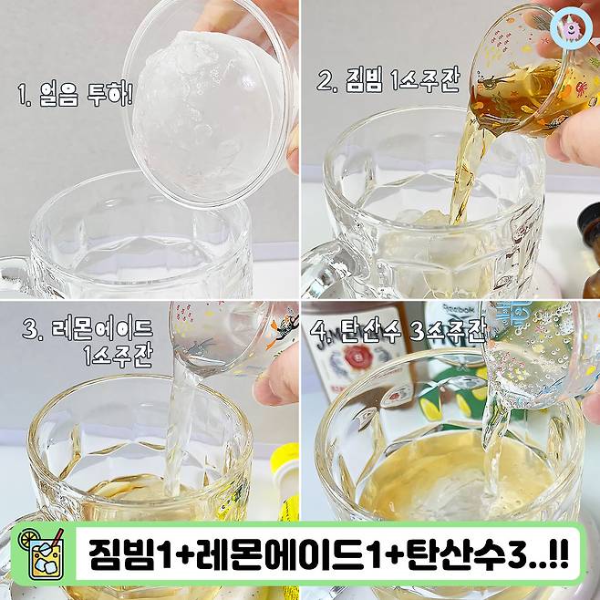 우선 준비하신 잔에 얼음을 양껏 넣으시고 <짐빔 1소주잔>, <레몬에이드 1소주잔>, <탄산수 3소주잔>을 넣어주세요! 이렇게만 하면.. 끝입니다ㅋ.ㅋ 정말 너무 쉽죠?!
