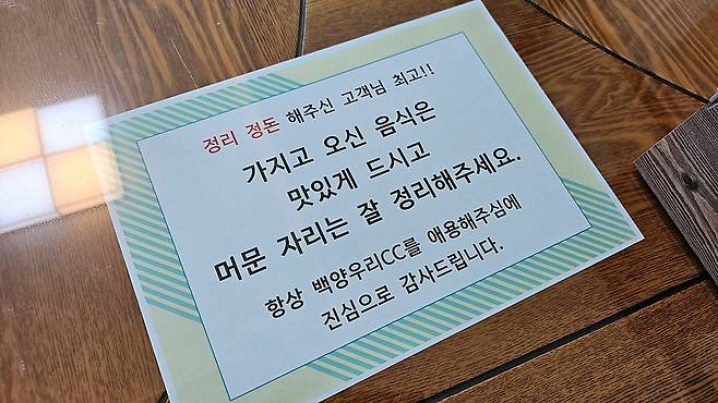 백양 우리CC는 음식을 싸오는 것을 허용하고, 별도 취식 공간도 제공합니다. 4개의 테이블이 준비되어 있고, 편하게 먹고 잘 치우면 됩니다.