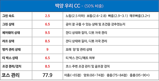 백양 우리CC는 지루함 없는 즐거운 플레이 환경을 제공합니다. 페어웨이의 잔디 상태는 좋았으나 그린과 그린 주변 잔디는 페어웨이 관리상태 대비 아쉬움이 남습니다. 캐디 사용 여부를 직접 선택할 수 있고, 셀프 식음 공간도 제공하며 전체 이용료가 저렴하기 때문에 또 방문할 계획입니다.