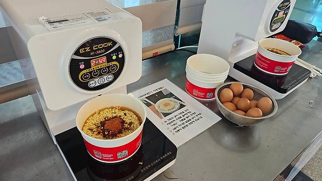 라면은 셀프로 끓여먹는 시스템입니다. 꼬들꼬들한 면발을 좋아하고 계란도 취사선택할 수 있어 좋았습니다.