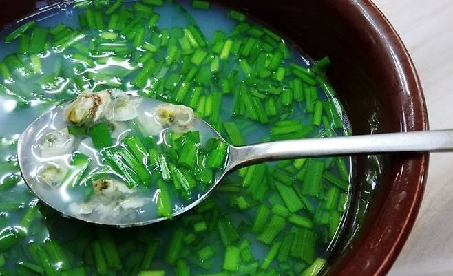 재첩은 그냥 끓여 드시는 것도 좋지만 비타민 시(C)가 풍부한 부추를 듬뿍 넣어 함께 끓여 드시는 것이 핵심입니다.