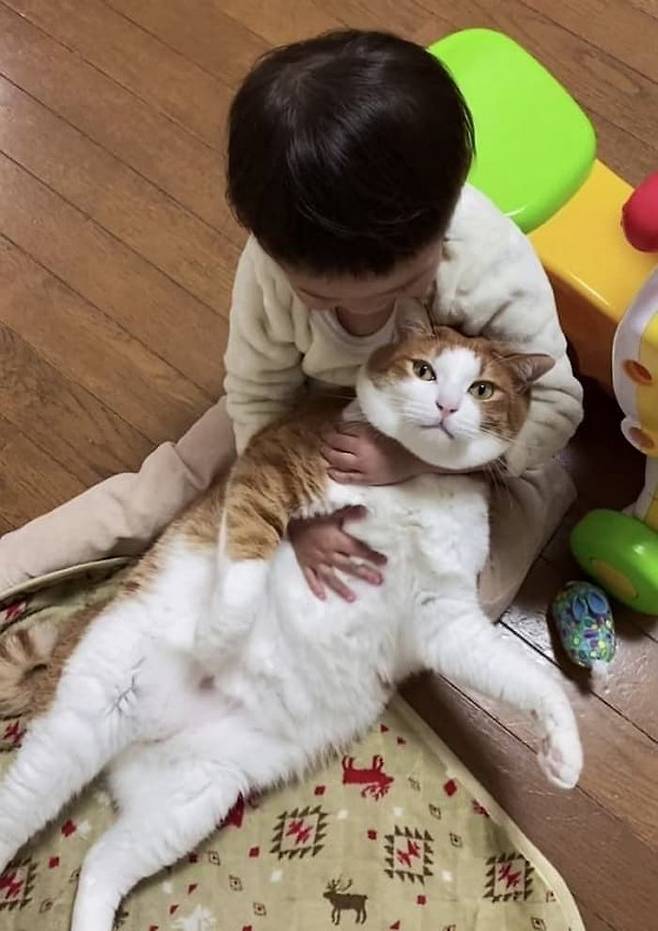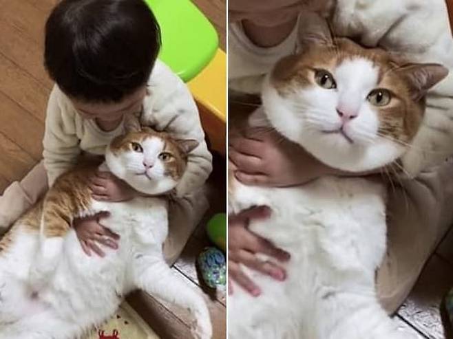 아무래도 집사가 아닌 아기가 자기를 품에 끌어 안고 있자 고양이는 조용히 있는 것으로 보여지는데요.