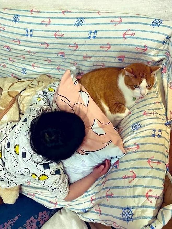 실제로 어렸을 때부터 이 둘은 서로 꽁냥꽁냥하면서 지내왔다고 합니다. 고양이도 알고 보면 아기를 무척 많이 아끼고 사랑한다는 사실 잊지 말아야겠습니다.