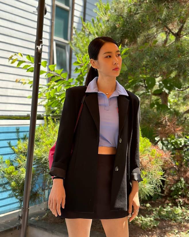 두 번째 사진에서는 블랙 오버사이즈 재킷에 라벤더 컬러 셔츠를 레이어드한 세미 포멀 스타일을 선보이고 있다. 재킷의 볼륨감 있는 실루엣과 셔츠의 크롭 길이로 모던하고 트렌디한 분위기를 연출했다. 미니멀한 액세서리로 깔끔함을 더하며 도시적인 감각을 보여주고 있다.