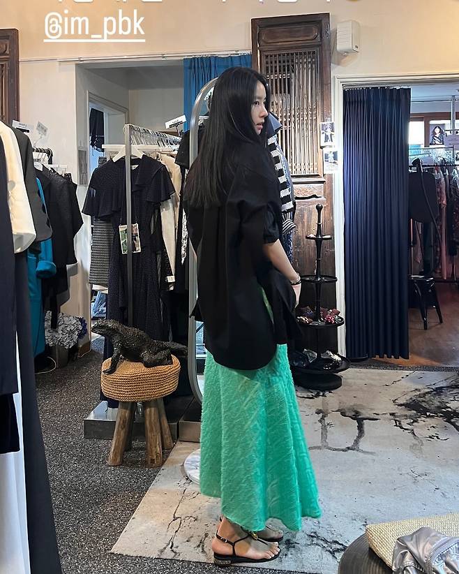 네 번째 사진에서는 블랙 톱에 민트 그린 컬러의 플리츠 스커트를 매치하여 상큼하고 생동감 있는 룩을 연출하고 있다. 스트랩 샌들로 여름철 감성을 더하며, 컬러 블로킹 기법을 활용해 시선을 사로잡는 스타일링을 완성했다.