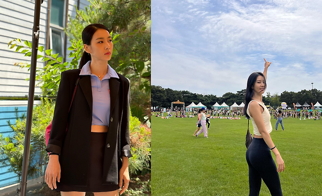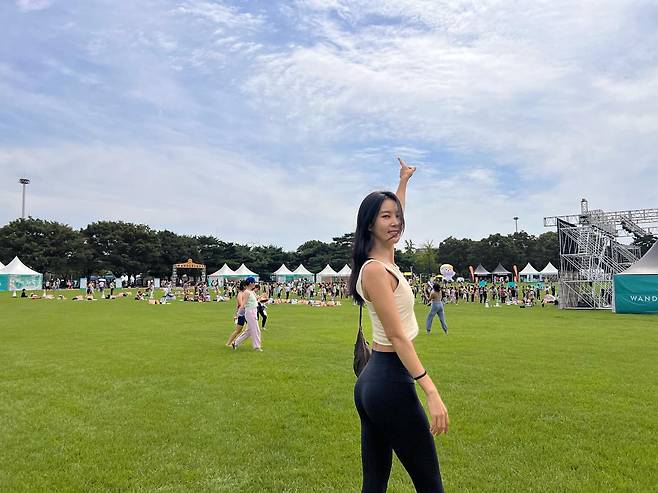 첫 번째 사진에서 김정민은 야외 페스티벌에서 편안하면서도 세련된 캐주얼 룩을 연출하고 있다. 베이지 톤의 민소매 톱과 블랙 와이드 팬츠를 매치하여 활동성과 스타일을 동시에 잡았다. 크로스백을 메고 한 손을 들어 올린 자연스러운 포즈로 자유분방한 매력을 드러내고 있다.