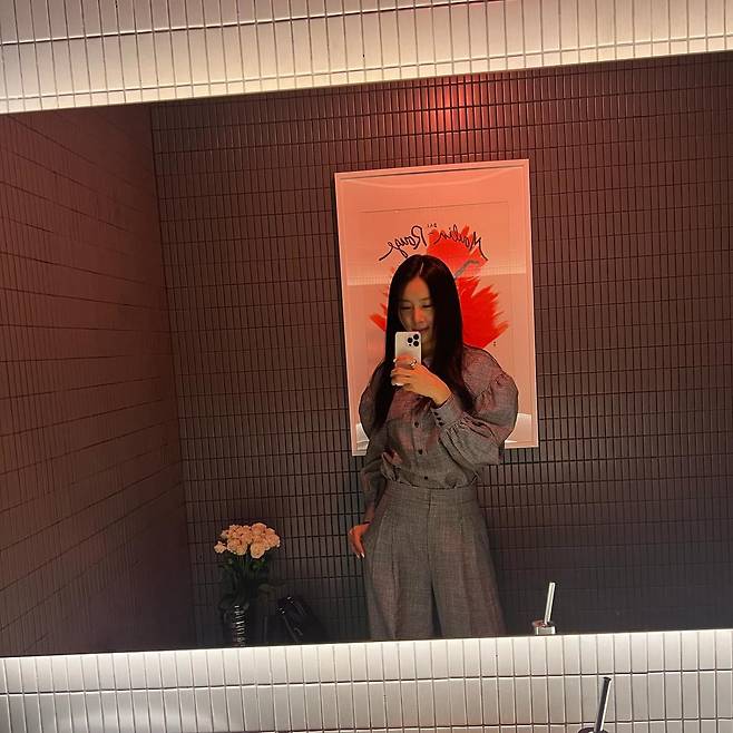 세 번째 사진에서는 그레이 체크 패턴의 셔츠 드레스로 클래식하면서도 현대적인 스타일을 완성하고 있다. 오버사이즈 핏의 셔츠를 드레스처럼 착용하여 편안함과 우아함을 동시에 표현했다. 거울 셀피를 통해 자연스러운 일상의 모습을 담아내며 친근한 매력을 어필하고 있다.