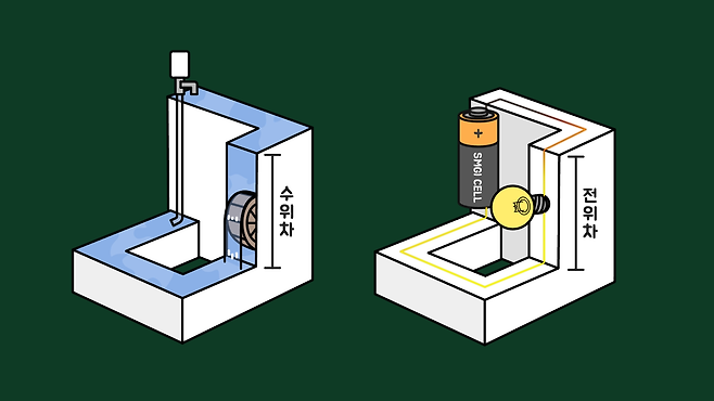 개념의 이해를 돕기 위해 물레방아로 예를 들어 보면 물레방아를 돌릴 때 펌프로 물을 끌어 올린 뒤 중력에 의한 위치에너지를 만들어 물을 떨어뜨리는 힘으로 물레방아를 돌립니다. 마찬가지로 전류가 흐르려면 양극에 전위차가 있어야 하고, 양극과 음극의 전기적 위치에너지에 차이를 만들어 전류를 흐르게 하는 것이 전압입니다.