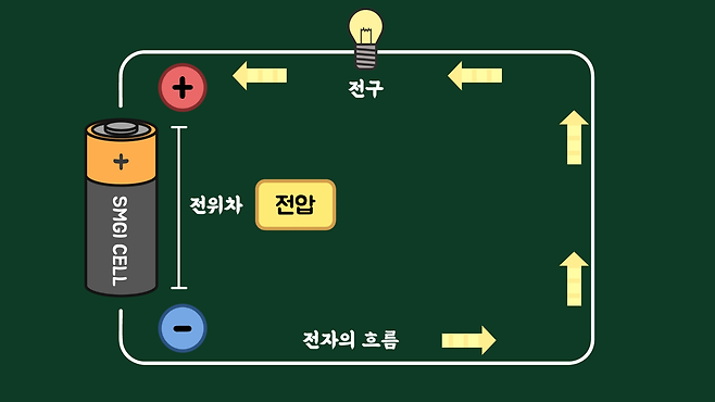 양극은 전기적 위치에너지인 전위가 높고, 음극은 전위가 낮으므로 두 극 사이에 전위차가 생기는데, 이 차이를 전압이라고 합니다.