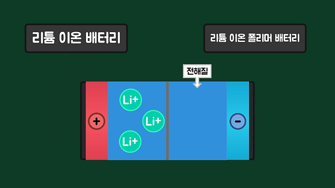 이때 리튬 이온 배터리와 리튬 이온 폴리머 배터리의 차이는 리튬 이온이 이동하는 통로인 전해질의 종류에 있는데, 리튬 이온 전지는 액체 상태의 전해질인 전해액을 사용하고, 리튬 이온 폴리머 전지는 젤 형태의 폴리머 전해질을 사용하는 차이가 있습니다.