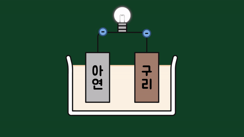 그리고 구리판과 아연판을 도선으로 연결하면 아연판에서 구리판 쪽으로 음(–)전하가 이동하고, 구리판에서 아연판 쪽으로 전류가 흐르면서 전구에 불이 들어옵니다. 시간이 지나면 전기화학 반응으로 수소 이온(H⁺)이 만들어지고, 구리판과 접하고 있던 전해질의 수소 이온들이 구리판에 도달한 음전하와 만나면 표면에서 수소 기체(H₂)를 형성합니다.
