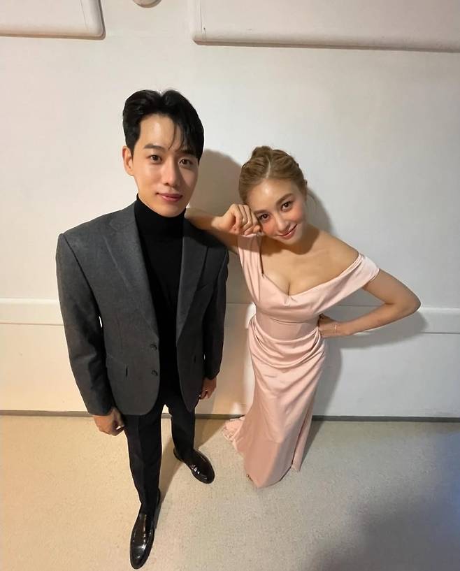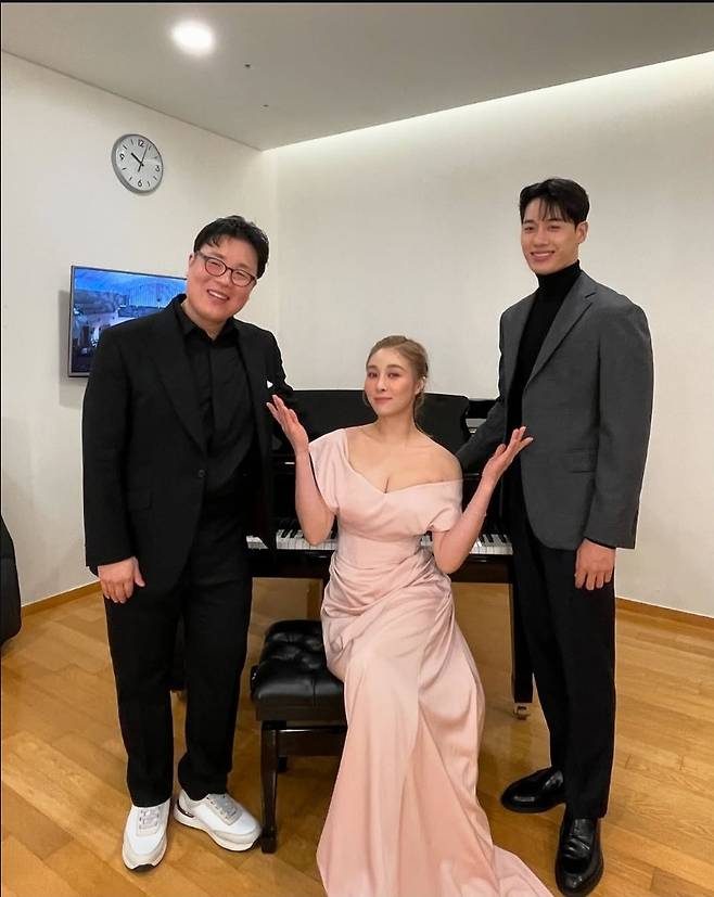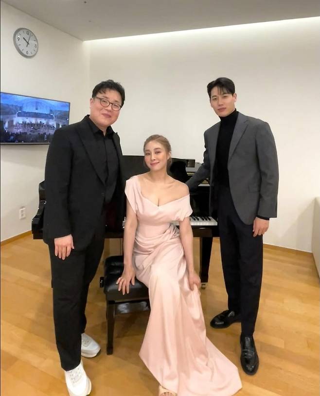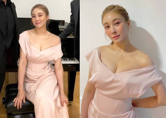 옥주현은 연핑크빛 드레스로 클래식한 여성미를 강조했습니다.