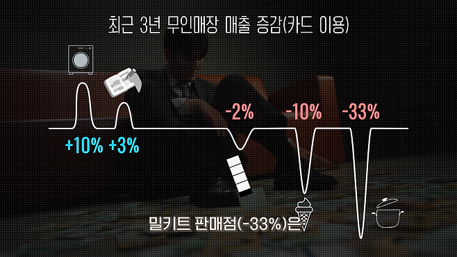 매출 증감으로 따져보자. 최근 3년 새 신용카드 평균 매출이 가장 뛴 곳은 무인 세탁소(10%)였고, 스터디 카페(3%) 등도 매출이 올랐다. 반면 사진관(-2%)이나 아이스크림 가게(-10%), 밀키트 판매점(-33%)은 매출이 줄었다. 근데 이것도 매장마다 천차만별이다.