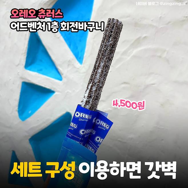 네 번째는 최근 롯데월드에서 가장 핫하다는 <오레오 츄러스>에요. 오레오와 츄러스의 조합에 화이트 토핑크림까지...☆ 이것이야 말로 맛이 없을 수 없는 조합 아닌가요?
