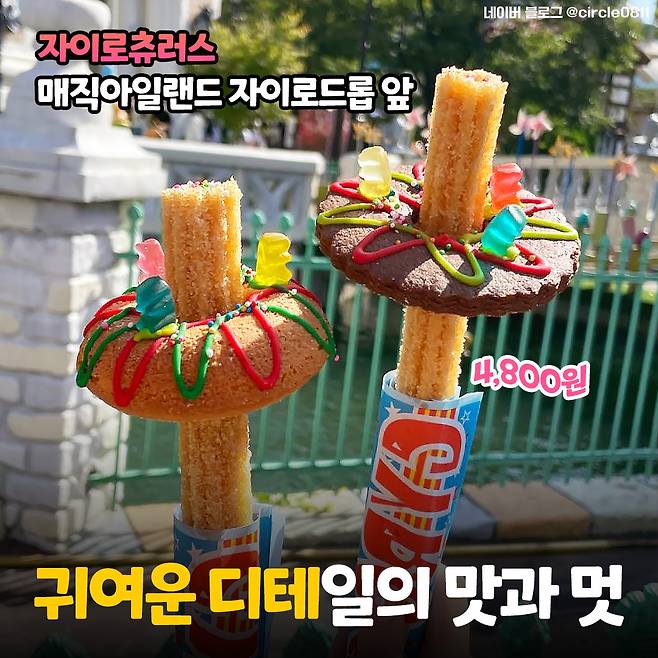 밥심이 첫 번째로 픽한 간식은 바로 이름부터 아찔한 <자이로츄러스>에요. 외부 자이로드롭 놀이기구 앞 '캔디캐슬'이라는 매점에서 판매한다고 해요.