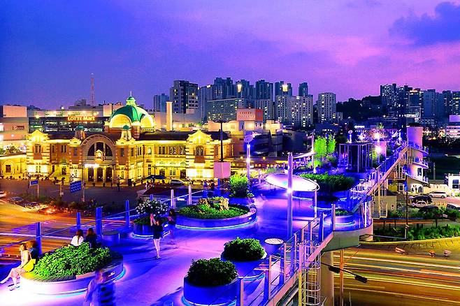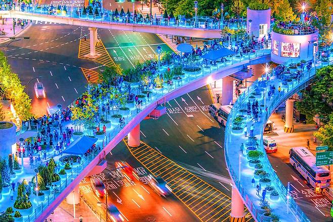 서울로 7017은 서울역의 옛 고가도로를 재탄생시킨 산책로로, 도심 한가운데에서 밤의 화려한 서울을 느낄 수 있는 곳입니다.