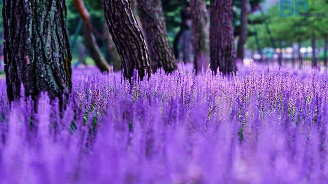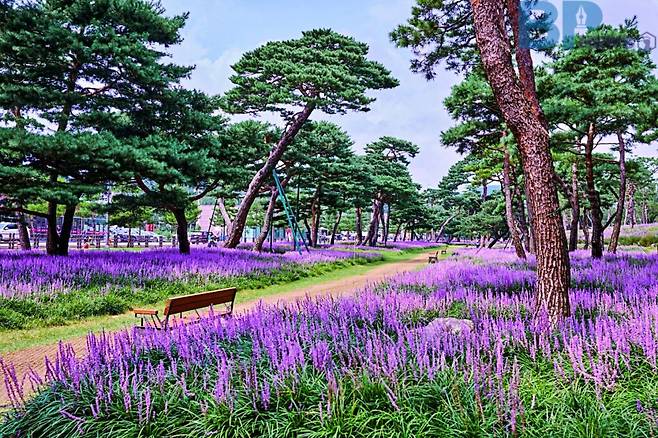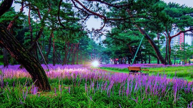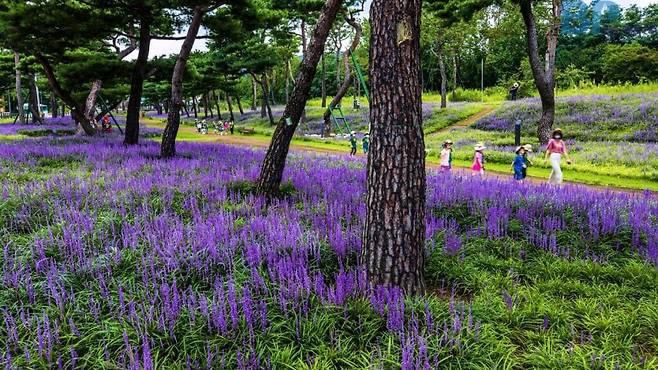 연보랏빛 맥문동이 땅을 가득 채우고 초록빛 소나무 줄기가 수직으로 솟아 있는 구조는 흔히 볼 수 없는 독특한 조합으로, 이색적인 배경 속에서 사진을 남기기에 제격이다.