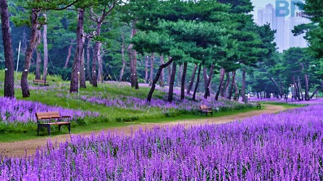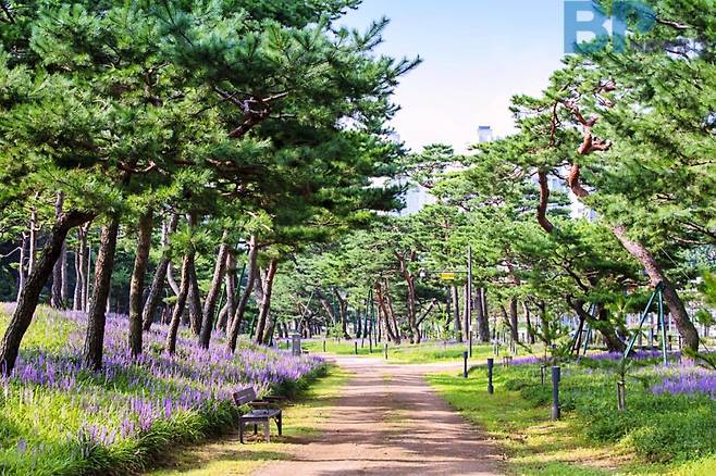 연보랏빛 맥문동이 땅을 가득 채우고 초록빛 소나무 줄기가 수직으로 솟아 있는 구조는 흔히 볼 수 없는 독특한 조합으로, 이색적인 배경 속에서 사진을 남기기에 제격이다.