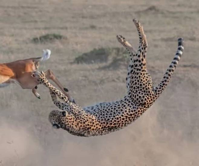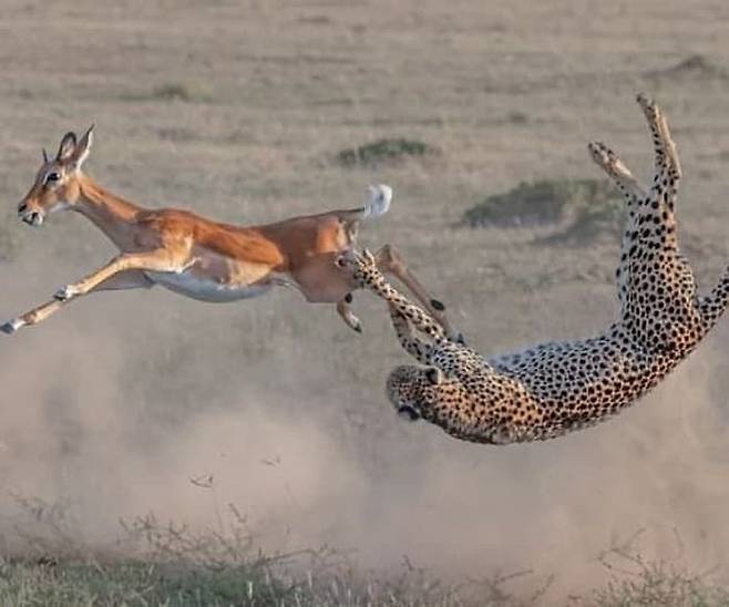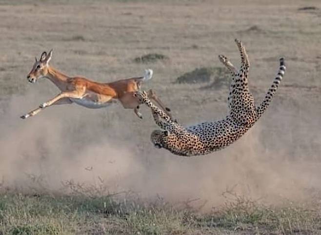 치타가 먹잇감을 놓치기 일보 직전 카메라에 찍힌 모습입니다. 이 사진은 케냐 마사이마라국립공원에서 촬영된 것이라고 합니다.