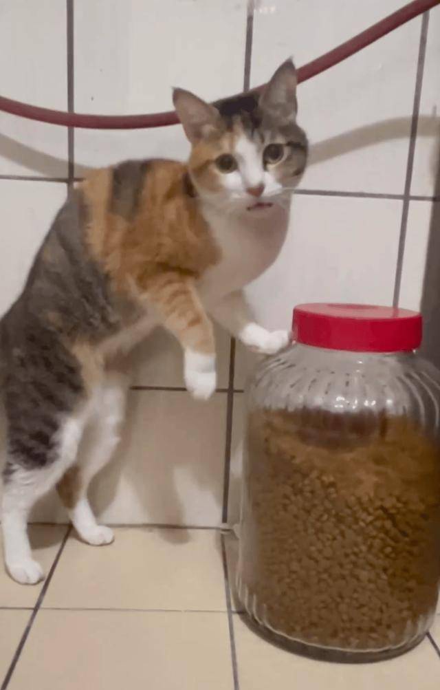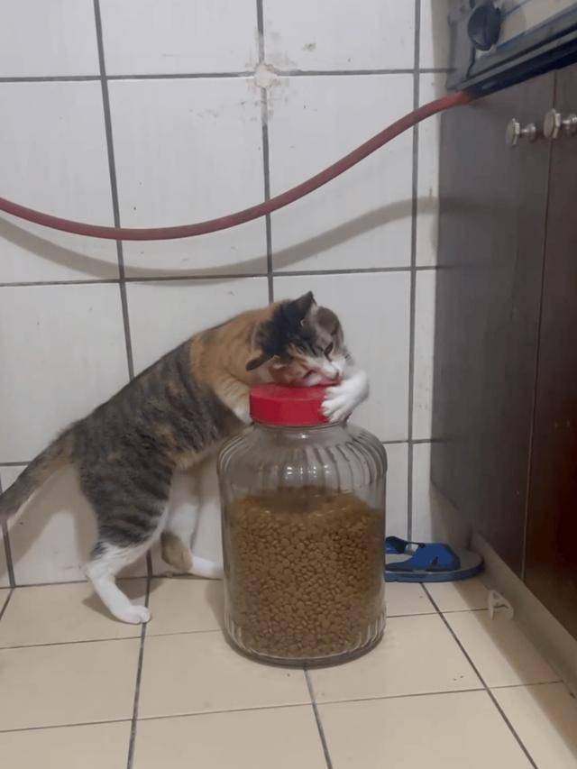 그런데 이 고양이가 사료통 뚜껑을 스스로 열 수 있게 되었다니 정말 놀랍습니다. 두 앞발로 사료통을 꼭 안고 능숙하게 뚜껑을 돌려 여는 모습이 마치 사람 같습니다.