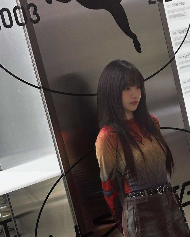 체인 벨트로 포인트를 더하면서 조유리 특유의 힙한 감각이 살아나요.