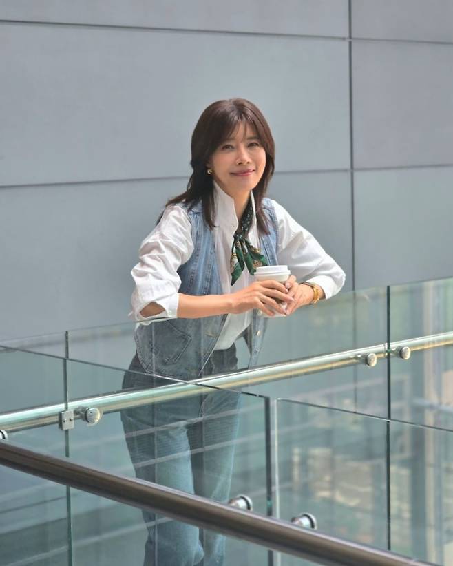 자연스럽게 풀어낸 긴 생머리와 내추럴한 메이크업이 전체 룩의 분위기를 깔끔하게 정돈해주네요.