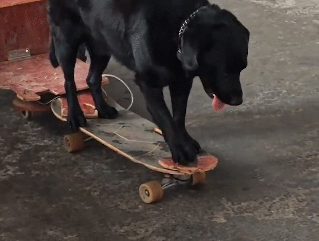 어느 날, 한 시민이 길을 걷다가 스케이트보드를 타고 유유자적하는 강아지를 발견했습니다. 강아지가 탄 스케이트보드는 특별한 발판이 있어 더욱 눈에 띄었습니다. 강아지가 발로 가볍게 힘을 주자 보드가 알아서 앞으로 나아가는 모습은 마치 "제 실력 좀 보세요"라고 뽐내는 듯했습니다.