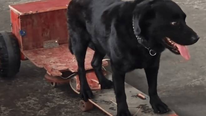 더욱 흥미로운 점은, 스케이트보드 뒤에 바퀴 달린 나무 상자가 연결되어 있어 사람도 함께 탈 수 있어 보였습니다.