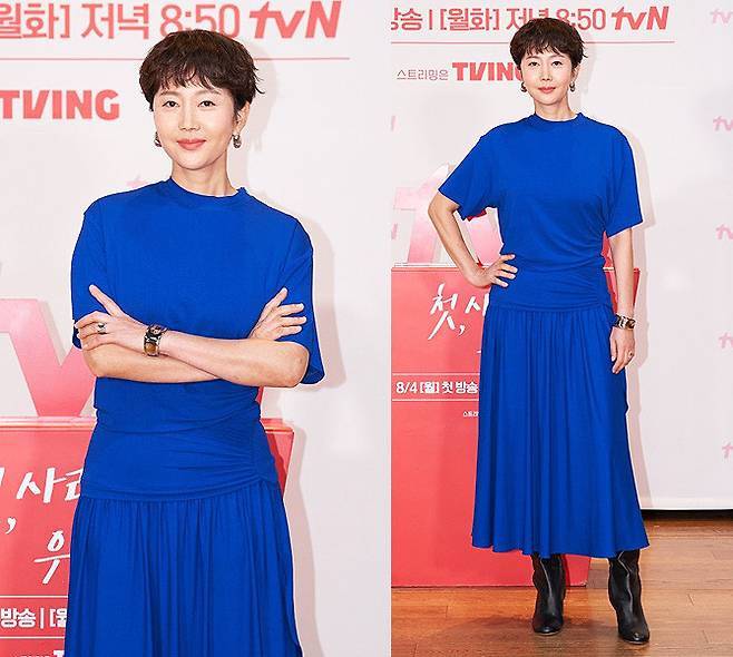 배우 염정아가 세련된 블루 원피스로 시선을 사로잡았습니다.