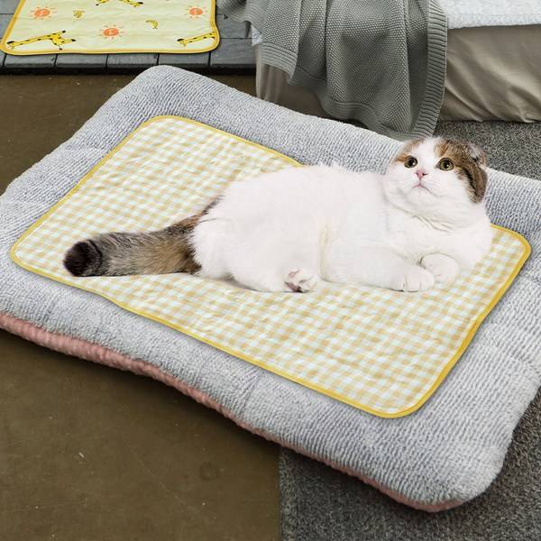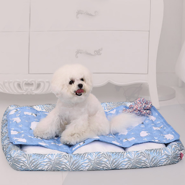 시원한 냉감 원단을 사용한 쿨매트입니다. 아주 얇은 제품으로 쿠션감은 없어요. 바닥에 두고 사용해도 좋지만, 기존에 사용하던 강아지 침대 위에 올려놓고 사용하기 좋답니다.