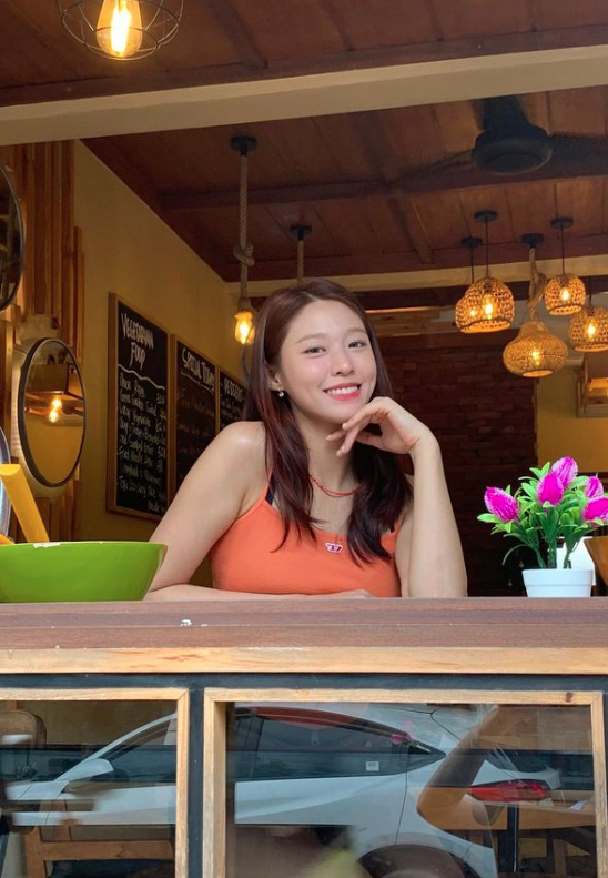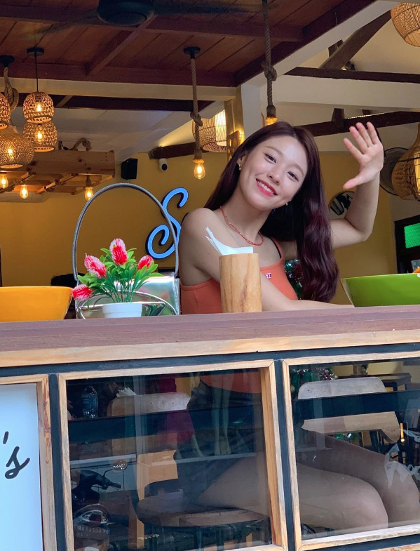 설현은 오렌지빛 상의에 오렌지빛 주얼리를 매치했고 핑크빛 메이크업으로 발랄한 여행룩을 완성했다.