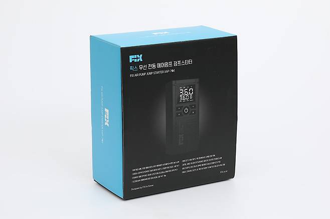 픽스 무선 전동 에어펌프 점프스타터 XAP-701은 픽스 브랜드 특유의 블루/블랙 투톤 박스에 담겨있다. 박스 앞면에는 제품 이미지가 인쇄되어 있어서 개봉 전에도 대략의 디자인을 감안할 수 있다.