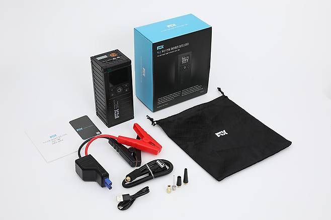 구성품으로는 픽스 무선 전동 에어펌프 점프스타터 XAP-701 본체와 점프용 클립, 공기 주입 노즐, 다기능 노즐, 충전용 USB 케이블, 휴대용 파우치, 그리고 사용 설명서와 보증서가 제공된다.