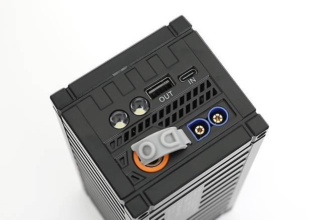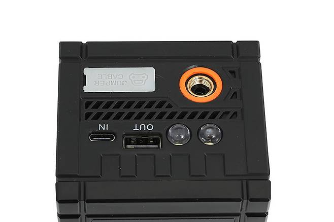 본체 윗면에는 USB C타입의 충전 단자와 USB A타입의 출력 단자, 두 개의 조명용 LED, 에어호스 연결구, 그리고 점프 케이블 연결구가 있다.