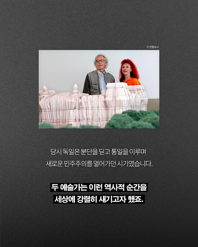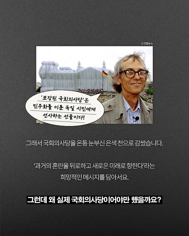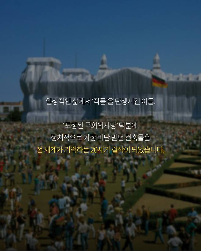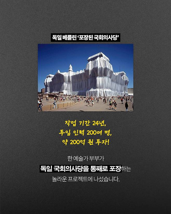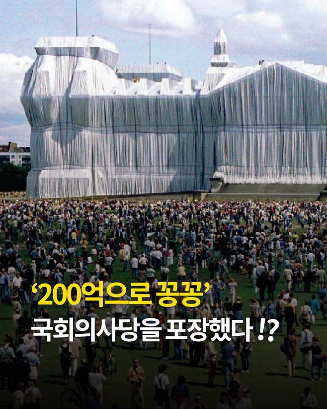 실제 독일 국회의사당을 은색 천으로 온통 감싼 작품, '포장된 국회의사당(Wrapped Reichstag)'은 당시 전 세계를 충격에 빠뜨렸습니다.