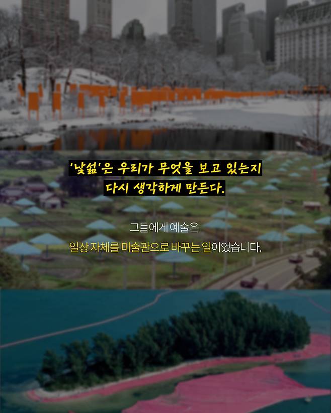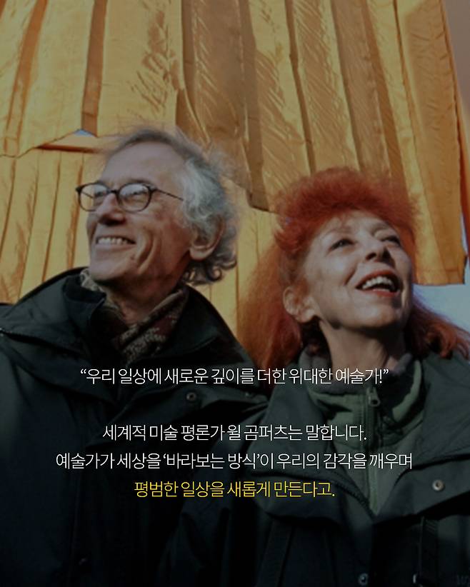 해당 작품은 예술가 크리스토와 잔 클로드 부부의 전설적인 '대지 미술' 프로젝트였습니다. 그들에게 예술이란 조용한 미술관에서 이루어지는 것이 아닌, 평범한 일상에 낯섦을 입히는 일이었죠.