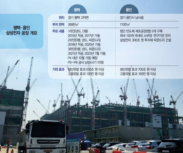 삼성전자는 평택캠퍼스에서 1~3라인을 가동하고 있다. 내년 10월 가동을 목표로 한 P4의 경우 공사가 진행 중이었고 P5도 착공 이전에 필요한 터 다지기 등 기초공사가 이뤄지고 있었다. P3 공사부터 시작해 현재는 P4 건설 현장에서 1년 가까이 일용직 근로자로 일하고 있다는 유 모(35) 씨는 “올해 초 경기가 안 좋다고 해서 공수(공사장 노동시간 단위를 의미)가 줄어드는 분위기였지만 설비 반입 등에 따라 7월부터 공수가 늘어날 것이라는 기대감이 일하는 사람들 사이에서 퍼지고 있다”며 “새로 유입되는 인원도 여전히 많다”고 말했다. 하청 업체의 한 관계자도 “평택 현장은 인기가 높은 편”이라며 “서울에서 가깝고 안전 관리가 잘되는 데다 일감이 장기적으로 계속 나올 것이라 오랫동안 일할 수 있기 때문”이라고 설명했다.