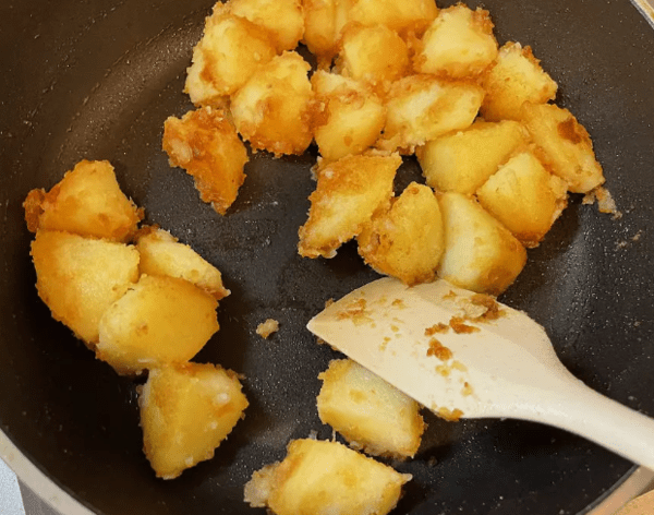 조미가 끝난 감자는 기름을 두른 팬에 올려 중불에서 천천히 익혀야 한다. 이때 뚜껑은 닫지 말고 열어둔 채 겉면이 노릇노릇하게 구워지도록 조리해야 수분이 날아가며 바삭한 식감이 살아난다.