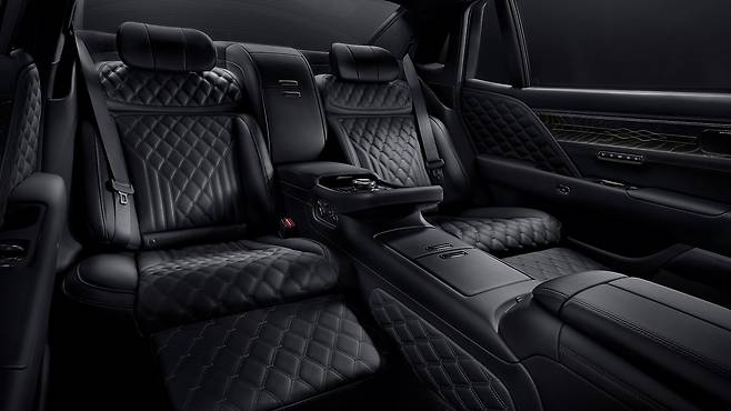 제네시스는 실내 공간에 있는 주요 버튼과 스위치, 가니쉬, 스티어링 휠 및 패들 시프트, 멀티펑션, 도어스텝 등에 모두 블랙 색상을 입혔으며, G90 롱휠베이스 블랙 전용 세미아닐린 퀼팅 시트를 적용했다.
