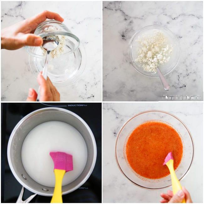 2. 찹쌀가루와 물을 끓여 풀을 쑨 뒤, 식으면 배·양파·마늘·생강·고춧가루와 섞어 양념장을 만든다.