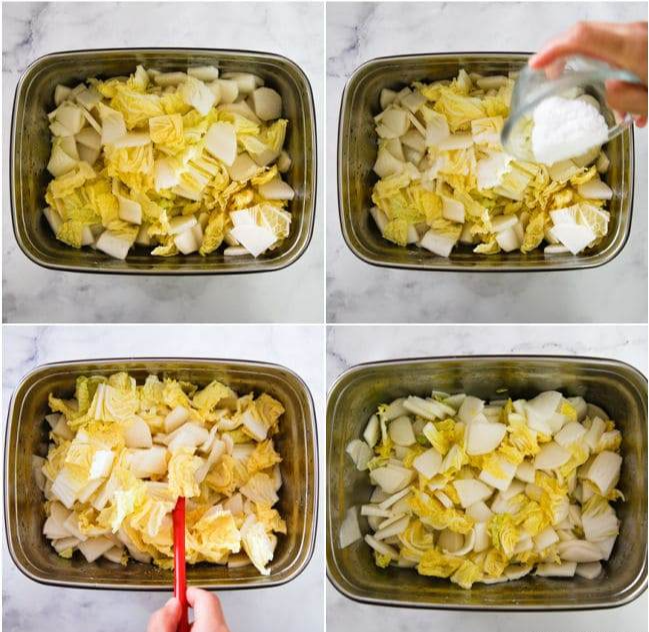 1. 무와 배추를 1cm 크기로 썰어 소금 2큰술을 뿌리고 30분간 절인다.