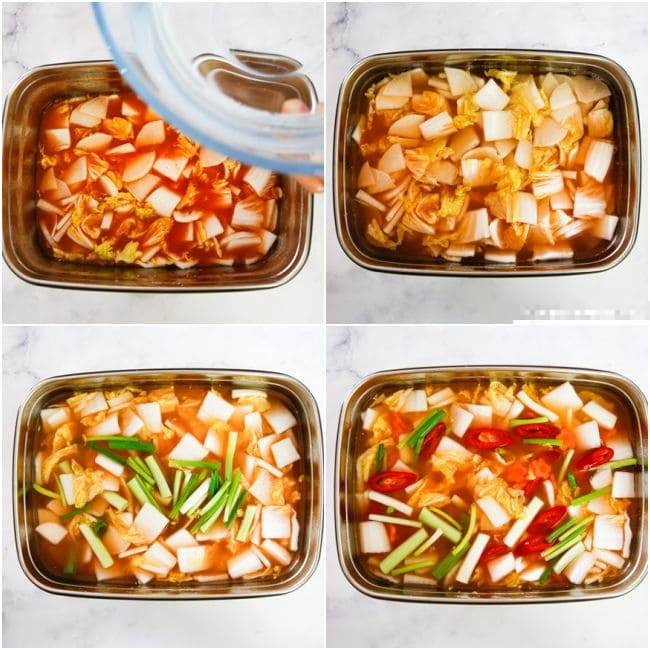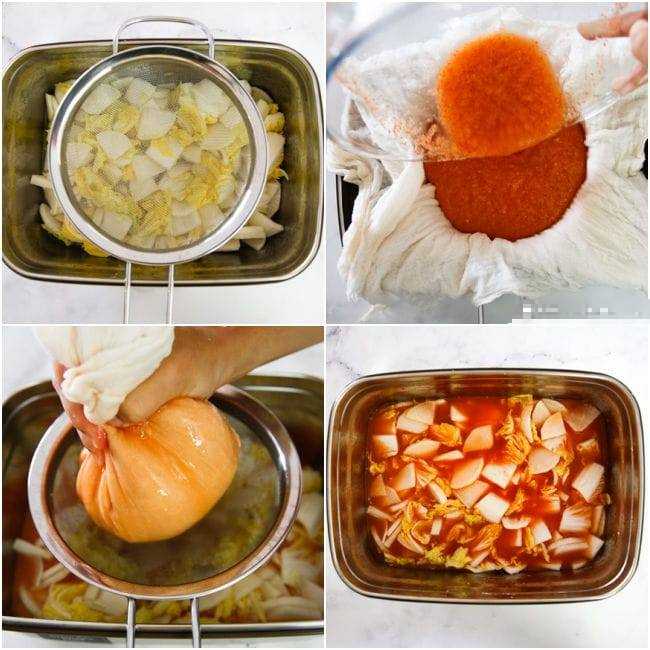 3. 절인 무와 배추 위에 양념장을 면포에 담아 짜 넣고, 물 8컵과 소금 1큰술을 더한다.