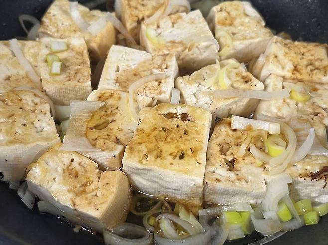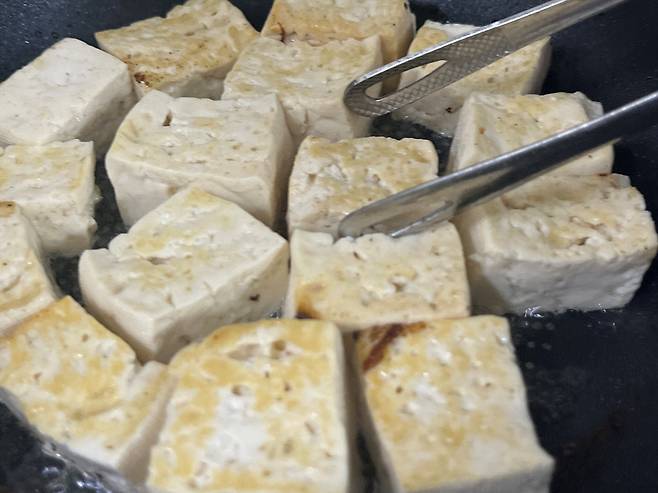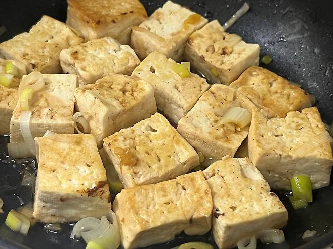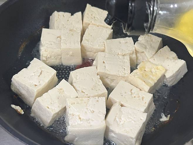 수분이 거의 날아가면 그때 식용유를 넣고 살짝 굽습니다. 두부 겉면을 노릇하게 구워주면 쫄깃하고 고소한 맛이 살아납니다.