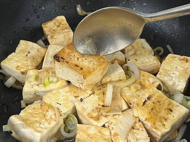 두부는 처음에 아무것도 넣지 말고 중강불에서 볶아 수분을 한 번 날리세요. 이렇게 하면 물도 생기지 않고 두부가 훨씬 쫀득해져요.