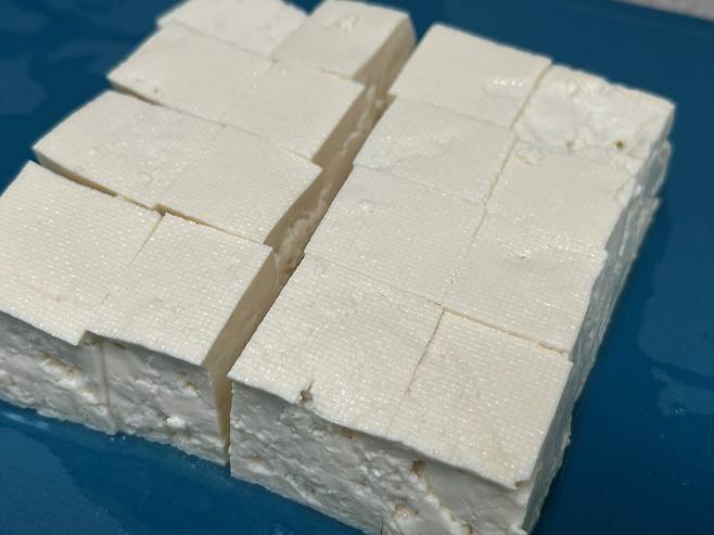 두부는 네모 모양으로 반듯하게 잘라 주세요. 두부는 잘라서 잠시 도마 위에 나오면 수분이 꽤 많이 빠집니다. 5분 정도 잘라서 그냥 두세요.