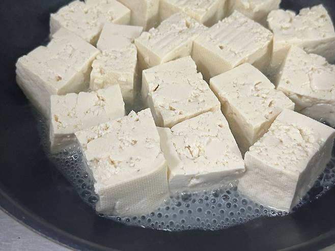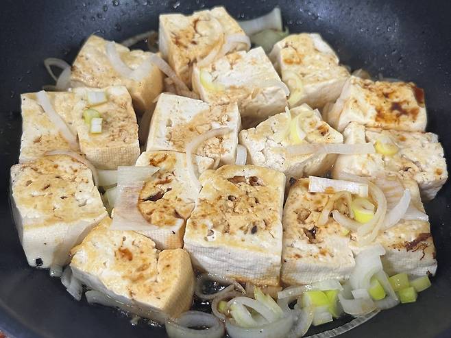 수분이 거의 날아가면 그때 식용유를 넣고 살짝 굽습니다. 두부 겉면을 노릇하게 구워주면 쫄깃하고 고소한 맛이 살아납니다.